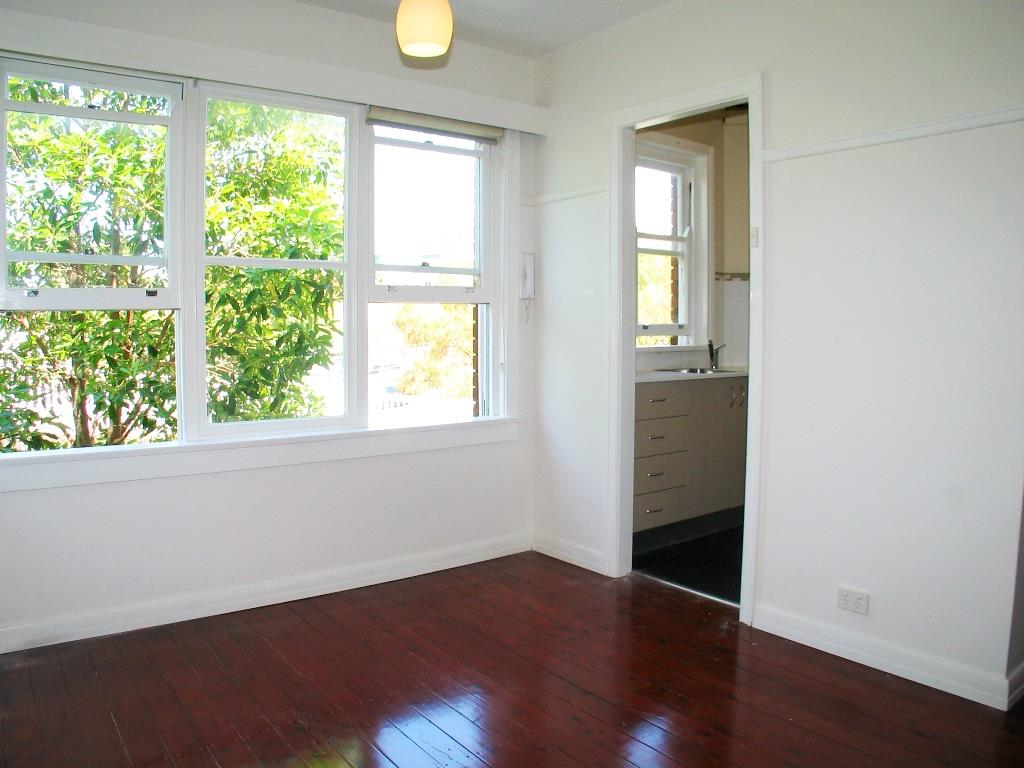 This spacious, T-shaped Studio features polished timber floors, high ceilings, modern kitchen and bathroom, and a pleasant leafy outlook.